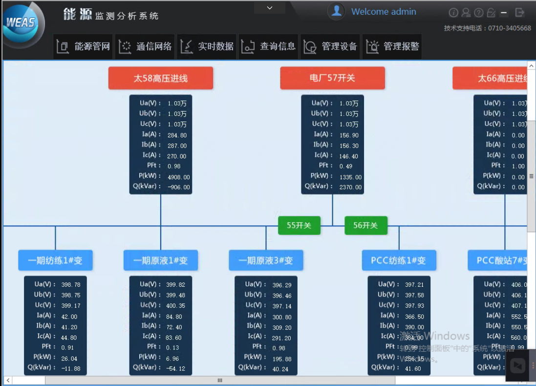 將化工企業用電以配電室為單位,一次圖展示全廠的用電結構,并顯示各用電單元的實時數據,包括三相電壓、電流、有功功率、無功功率、功率因數等。
