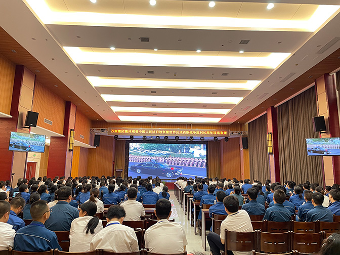 9月3日上午,萬洲電氣一樓多功能廳氣氛莊重而熱烈,萬洲集團400余名在家員工齊聚一堂,集中觀看中國人民抗日戰(zhàn)爭暨世界反法西斯戰(zhàn)爭勝利80周年現(xiàn)場直播。