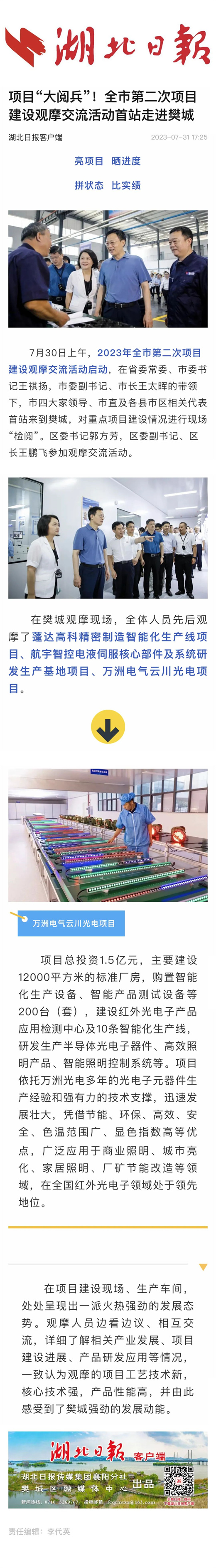 在項目建設現場、生產車間,處處呈現出一派火熱強勁的發展態勢。觀摩人員邊看邊議、相互交流,詳細了解相關產業發展、項目建設進展、產品研發應用等情況,一致認為觀摩的項目工藝技術新,核心技術強,產品性能高,并由此感受到了樊城強勁的發展動能。