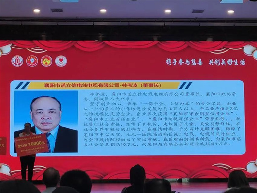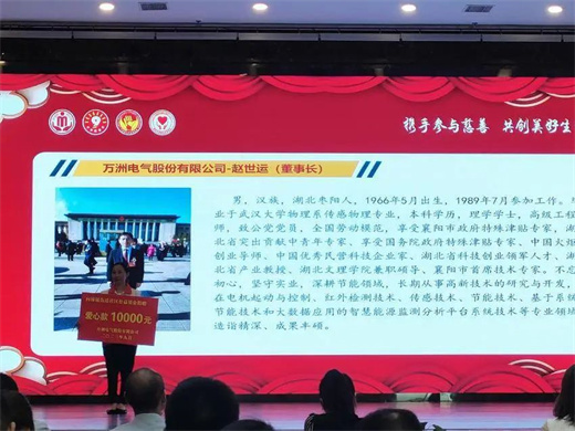 活動中,萬洲電氣股份有限公司捐贈10000元,襄陽市諾立信電線電纜有限公司捐贈10000元,襄陽世陽電機有限公司捐贈5000元。