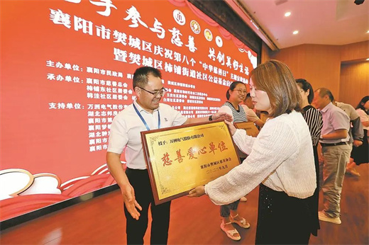 9月5日是我國第八個(gè)“中華慈善日”。當(dāng)日,由樊城區(qū)民政局等單位主辦的“攜手參與慈善 共創(chuàng)美好生活”2023年樊城區(qū)柿鋪街道“中華慈善日”宣傳活動暨“樊城區(qū)柿鋪街道社區(qū)公益基金”啟動儀式舉行。活動現(xiàn)場,區(qū)民政局向柿鋪街道授予“柿鋪街道·社區(qū)公益基金”牌匾,萬洲電氣股份有限公司、湖北諾伯特科技有限公司等公司捐贈1萬元以上的愛心基金。