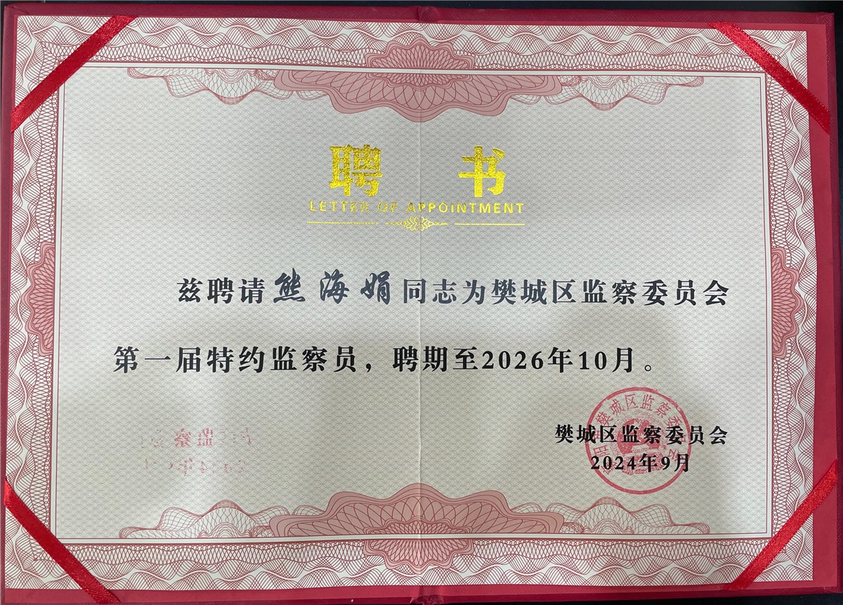 9月11日上午,樊城區監委召開第一屆特約監察員會議,聘請了12名特約監察員。萬洲電氣工會主席、行政部經理熊海娟被聘為樊城區監察委員會第一屆特約監察員,樊城區委常委、區紀委書記、區監委主任周華偉為特約監察員頒發聘書。