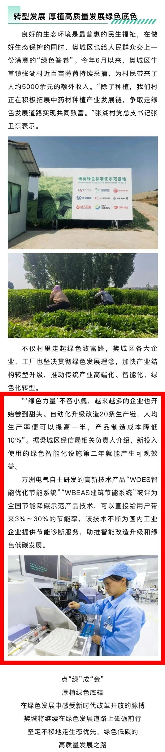 “‘綠色力量’不容小覷,越來(lái)越多的企業(yè)也開(kāi)始嘗到甜頭。自動(dòng)化升級(jí)改造20條生產(chǎn)鏈,人均生產(chǎn)率便可以提高一半,產(chǎn)品制造成本降低10%”。據(jù)樊城區(qū)經(jīng)信局相關(guān)負(fù)責(zé)人介紹,新投入使用的綠色智能化設(shè)施第二年就能產(chǎn)生可觀(guān)效益。