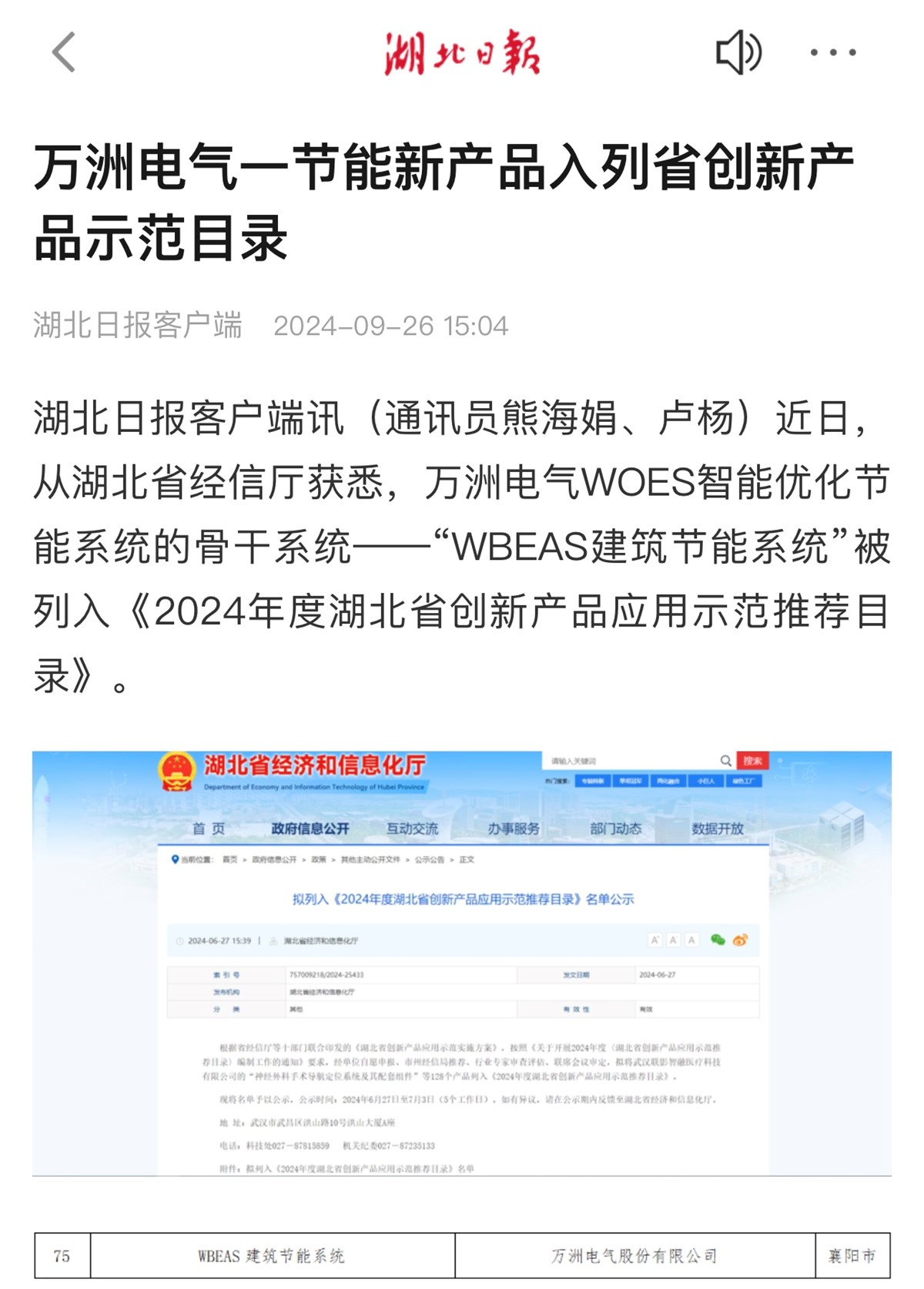 【湖北日報】萬洲電氣一節能新產品入列省創新產品示范目錄