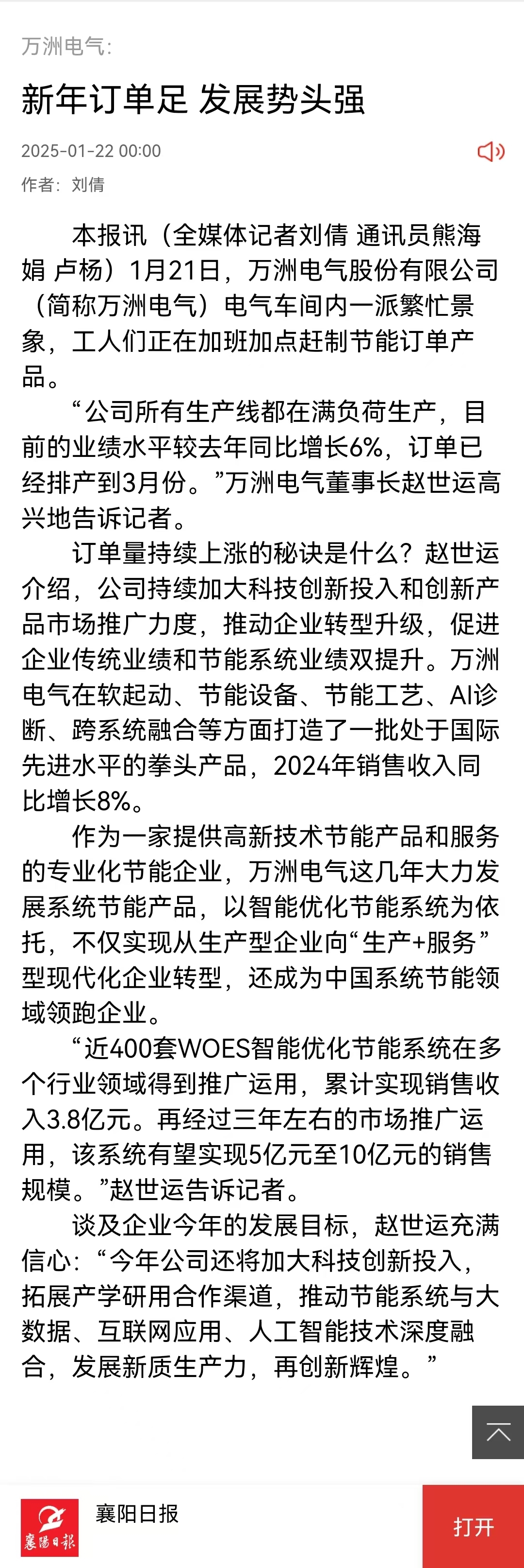 訂單量持續上漲的秘訣是什么?趙世運介紹,公司持續加大科技創新投入和創新產品市場推廣力度,推動企業轉型升級,促進企業傳統業績和節能系統業績雙提升。萬洲電氣在軟起動、節能設備、節能工藝、AI診斷、跨系統融合等方面打造了一批處于國際先進水平的拳頭產品,2024年銷售收入同比增長8%。