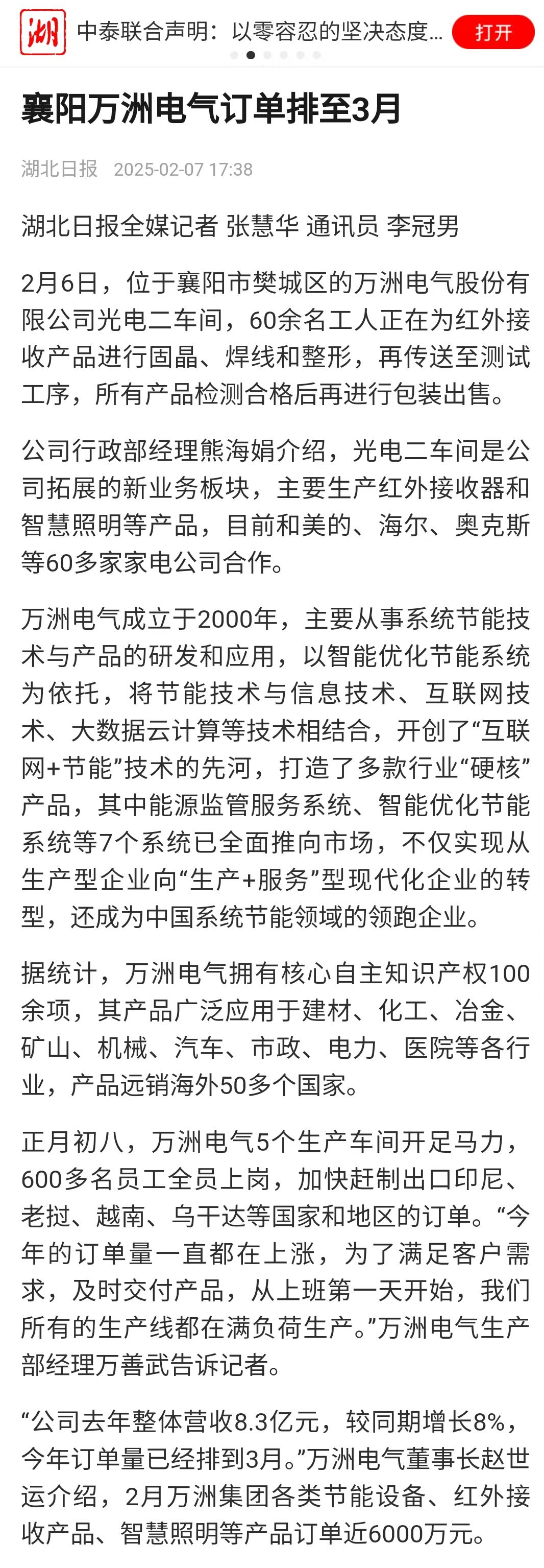 “公司去年整體營收8.3億元,較同期增長8%,今年訂單量已經(jīng)排到3月。”萬洲電氣董事長趙世運介紹,2月萬洲集團各類節(jié)能設(shè)備、紅外接收產(chǎn)品、智慧照明等產(chǎn)品訂單近6000萬元。
