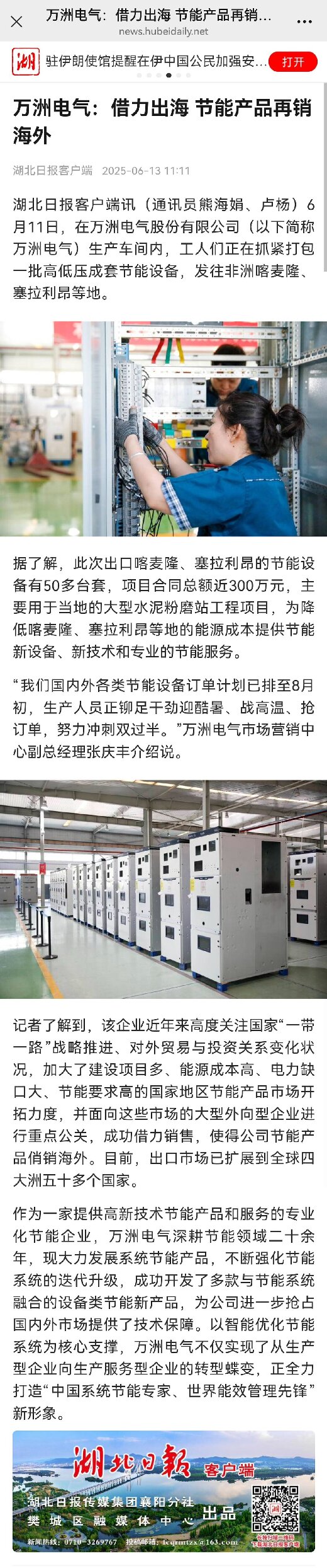 6月11日,在萬洲電氣股份有限公司(以下簡稱萬洲電氣)生產車間內,工人們正在抓緊打包一批高低壓成套節能設備,發往非洲喀麥隆、塞拉利昂等地。
