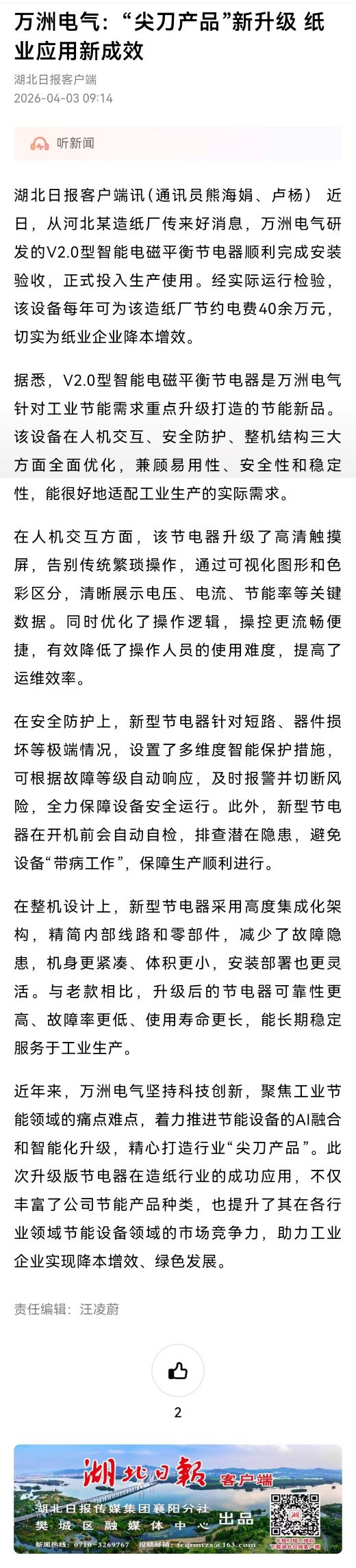 近年來,萬洲電氣堅持科技創(chuàng)新,聚焦工業(yè)節(jié)能領(lǐng)域的痛點(diǎn)難點(diǎn),著力推進(jìn)節(jié)能設(shè)備的AI融合和智能化升級,精心打造行業(yè)“尖刀產(chǎn)品”。此次升級版節(jié)電器在造紙行業(yè)的成功應(yīng)用,不僅豐富了公司節(jié)能產(chǎn)品種類,也提升了其在各行業(yè)領(lǐng)域節(jié)能設(shè)備領(lǐng)域的市場競爭力,助力工業(yè)企業(yè)實(shí)現(xiàn)降本增效、綠色發(fā)展。