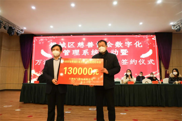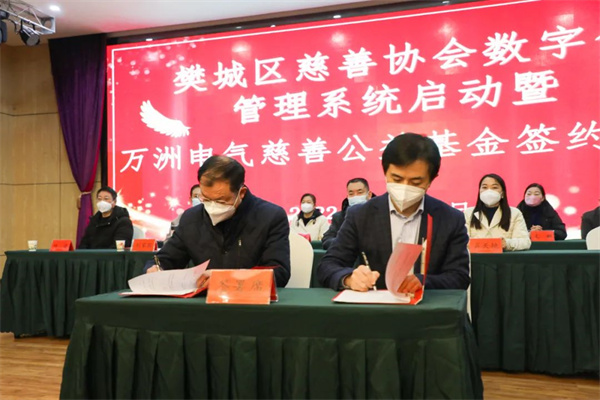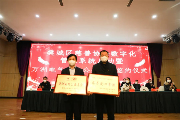 12月30日下午,在樊城區(qū)慈善協(xié)會舉辦的“ 樊城區(qū)慈善協(xié)會數(shù)字化管理系統(tǒng)啟動暨萬洲電氣慈善公益基金簽約”儀式上,萬洲電氣為樊城區(qū)慈善協(xié)會捐款13萬元成立“萬洲電氣公益基金”并獲“慈善愛心單位”榮譽稱號。萬洲電氣董事長、總經(jīng)理趙世運參加簽約儀式。