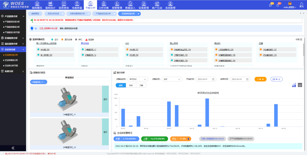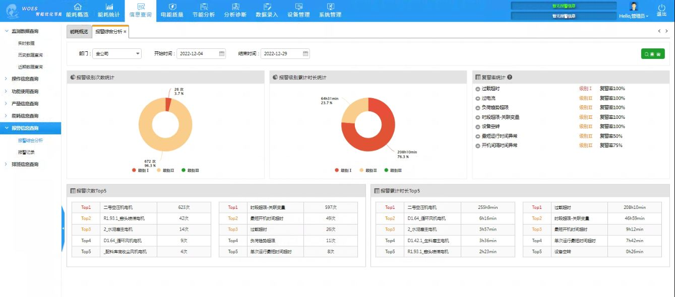 5、對水泥廠的各工段的主機設備和輔助設備之間設置關聯(lián)關系及空轉判別條件,對主機設備關停,而輔助設備沒有關停的情況進行及時報警,并計算因此導致的能源浪費量,幫助企業(yè)管理者詳細了解設備關聯(lián)運行情況,將異常定位到具備班組,解決以前有制度但執(zhí)行不到位情況,通過報警功能提醒操作人員及時操作,減少能源浪費。