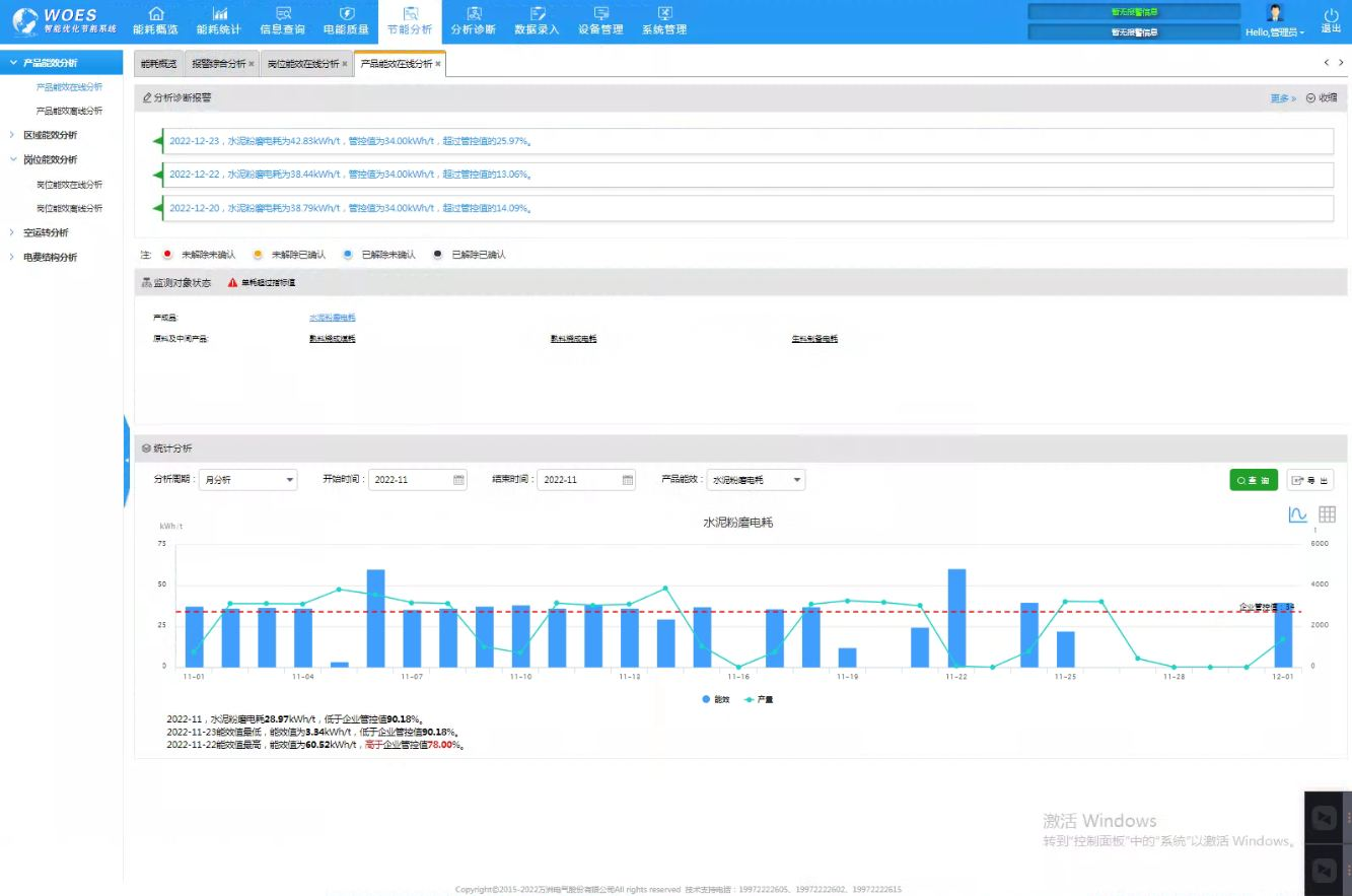 5、單耗、產(chǎn)量關聯(lián)分析節(jié)能。通過產(chǎn)品能效分析發(fā)現(xiàn)生料工區(qū)單耗存在異常情況;將能耗異常告知用戶后,并指導用戶通過系統(tǒng)發(fā)現(xiàn)份生料磨主電機、循環(huán)風機電機運行負荷均高于額定負荷的80%,且單耗均處于16.60-18.9kwh/t之間,合理調(diào)整生料磨主電機、循環(huán)風機負荷比例,保證負荷率處于75%~80%之間,生料工區(qū)單耗控制在了16.50kwh/t以內(nèi),平均每天減少電量7500-8000kwh,按全年生產(chǎn)100天計算,每年可約電費45萬元。