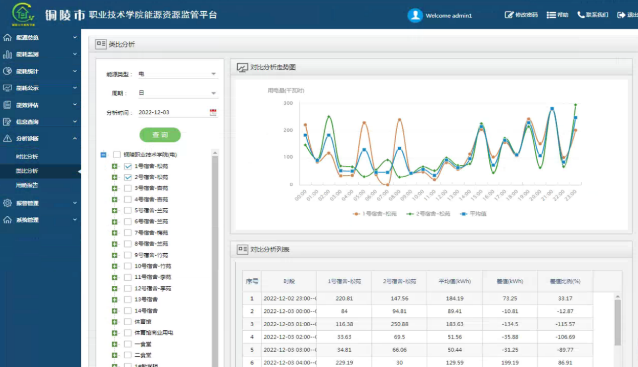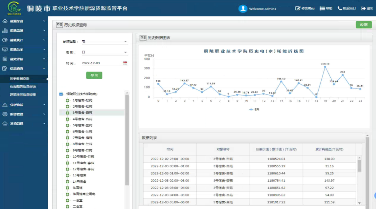 2、優化宿舍用電管理措施,減少能源浪費。學校宿舍樓一共有14棟,通過歷史數據查詢功能發現每天晚上除5號宿舍和9號宿舍在23點之后照明用電量有明顯的下降外,其他的宿舍樓照明用電持續運行到凌晨1點才有下降的趨勢,并未進行管控,學校發現該問題后,通過對宿舍樓進行統一照明用電管理,優化宿舍用電管理措施,避免能源浪費,每年學校宿舍樓節約3.29萬元。